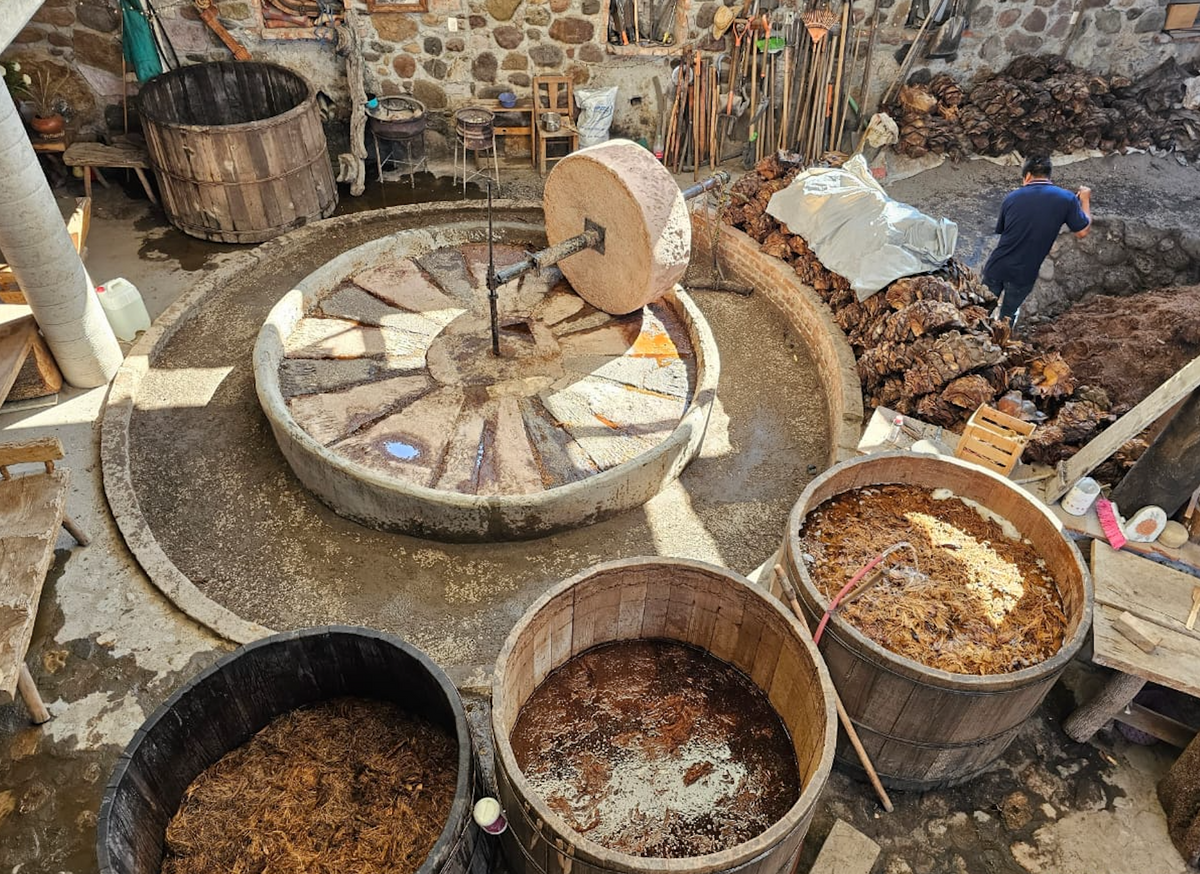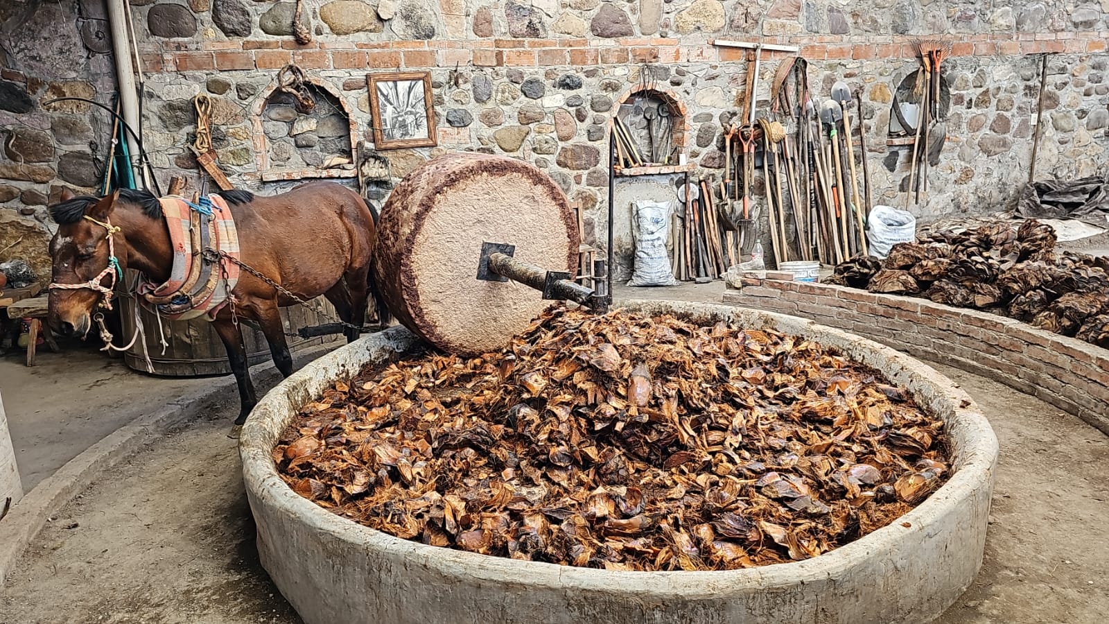 Once the cooking is complete, the piñas are crushed using a traditional tahona—a large stone wheel drawn by a mule or ox, which grinds the agave into a fibrous pulp. This method, passed down through generations, ensures the perfect consistency for fermentation.